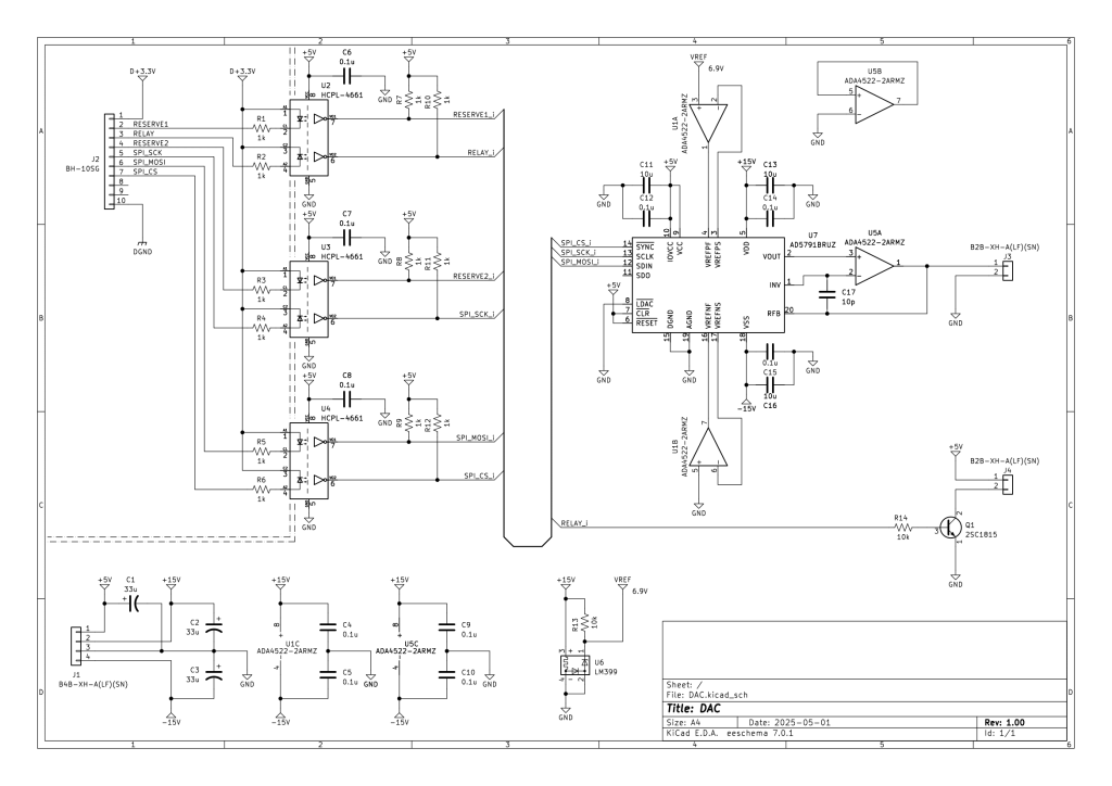 低分解能なDACを複数使用し、出力を乗算することで分解能を高める手法もありますが、部品点数が多くなり回路が複雑になってしまいます。そのため今回は、市販されている20bitDAC「AD5791」を用いました。1個18,000円と部品単価は高いですが、簡単な回路構成で高分解能、高リニアリティのDA変換回路を製作することができます。