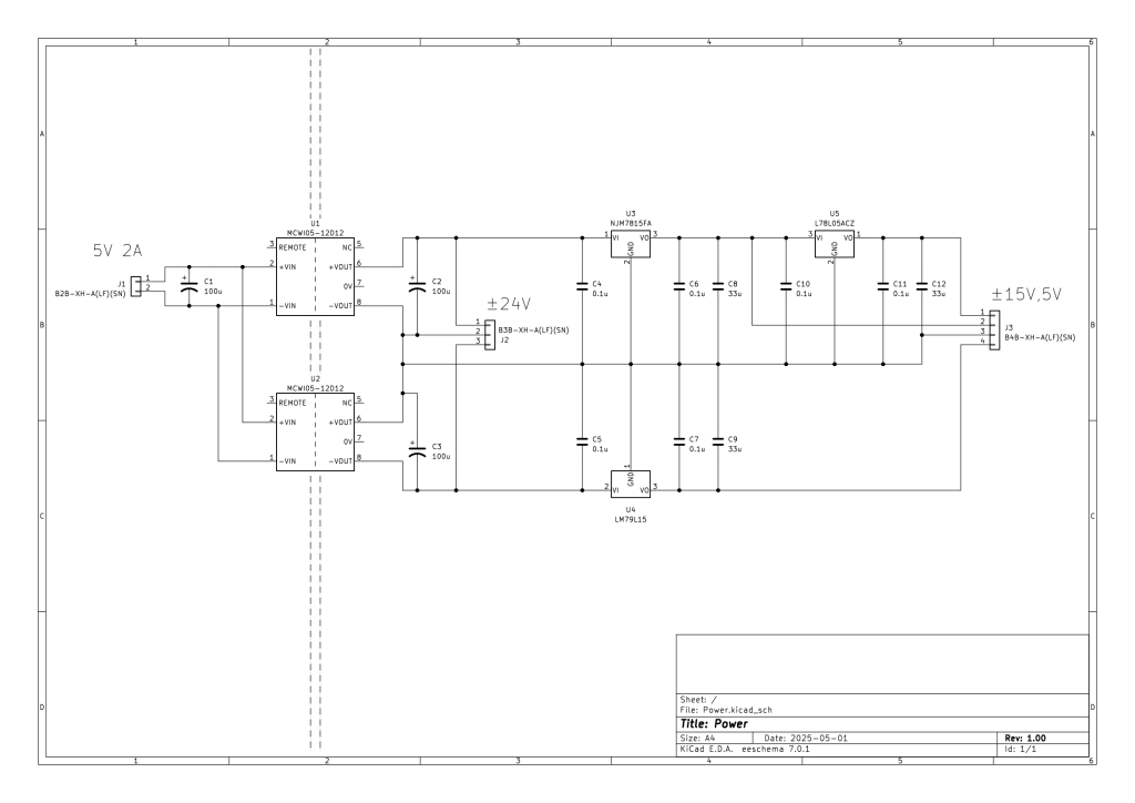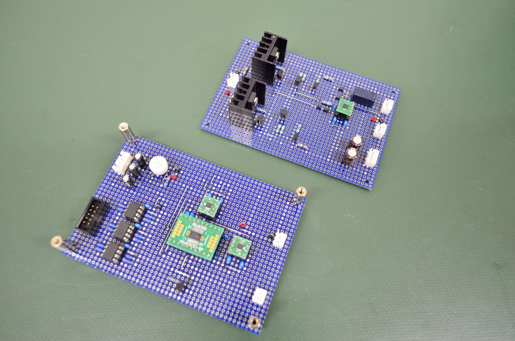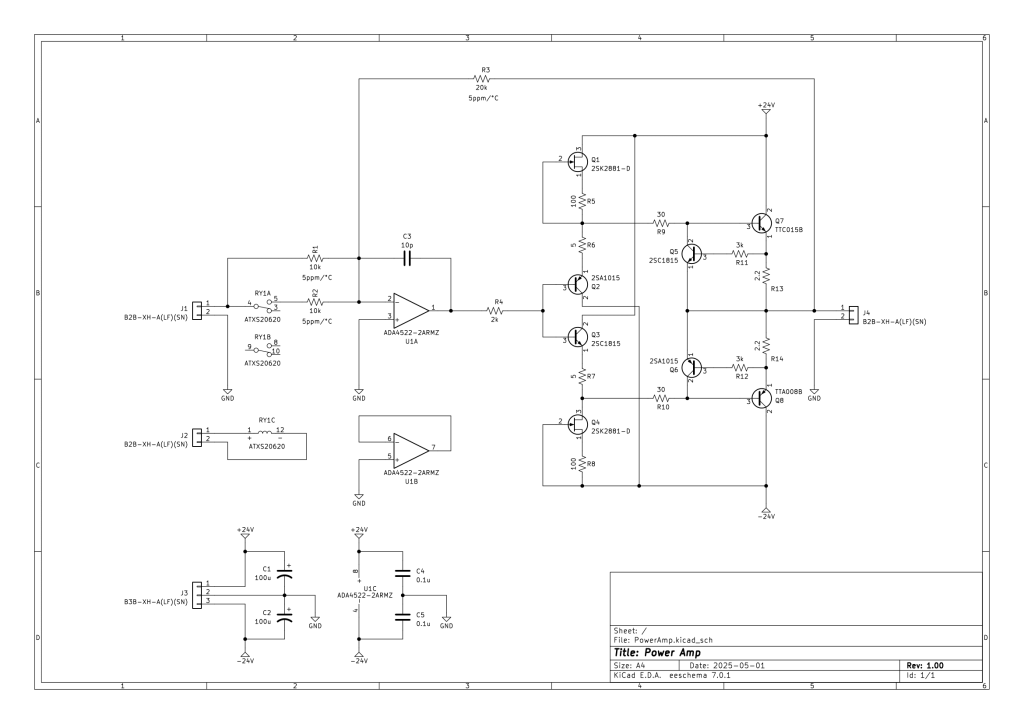 22V、200mA出力のパワーアンプです。270mA付近で過電流リミッタが働くように設計しました。このアンプの入力にDACからの出力である±6.95Vが入力され、電圧増幅と電力増幅を行い最終的な出力を得ます。パワーアンプは、2倍(12Vレンジ)と4倍(22Vレンジ)のゲインを持ち、リレーによりゲイン設定用の抵抗器を切り替えることで出力電圧範囲を可変します。