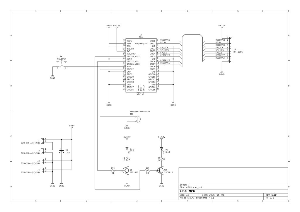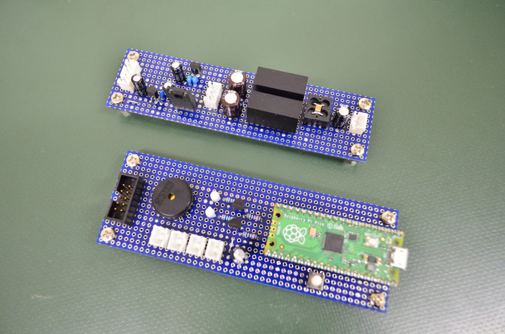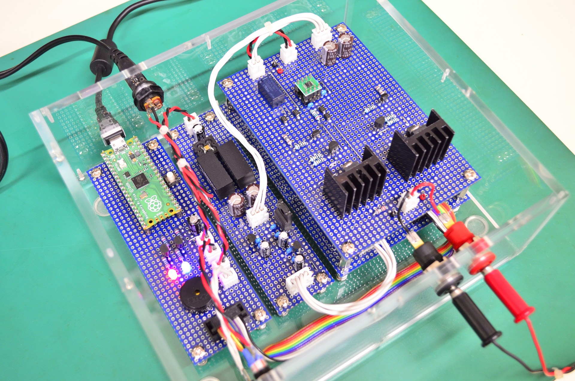 高安定可変電圧源のハードウェア構成を示します。高安定な基準電圧源と高分解能DACからなるDA変換回路、パワーアンプ回路、Raspberry Pi Picoを用いた制御回路から構成されています。