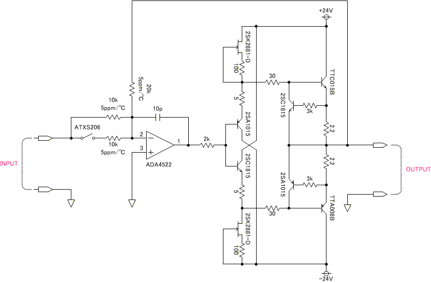 高安定な電圧源として構築するためには、パワーアンプ回路のゲインドリフトを小さくする必要があります。そのため、ゲインを決定する帰還には温度係数の優れた抵抗器を用います。今回は、温度係数5ppm/℃品を採用しました。これにより極めて高い短期安定度を実現しています。