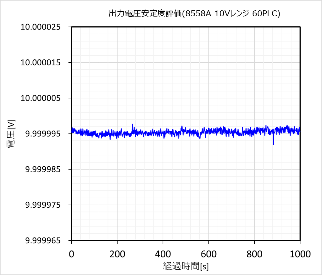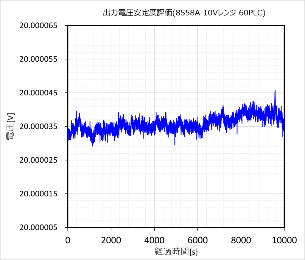 製作した高安定可変電圧源の出力電圧を10V、20Vに設定し、8558Aにより1秒間隔で電圧測定を行い短期安定度の評価を行いました。評価結果を以下に示します。高安定可変電圧源の出力電圧変動は1000秒間で±0.2ppm程度と高安定な電圧源を構築できていることが確認できました。